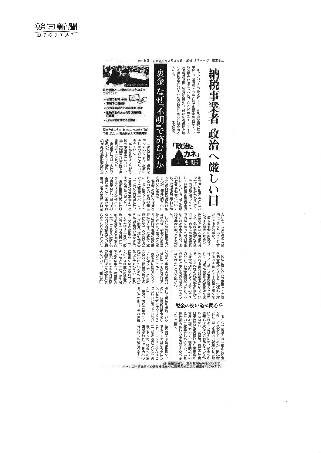朝日新聞 2024.2.26 納税事業者 政治へ厳しい目